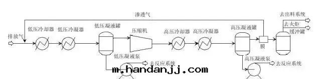 膜分離裝(zhuāng)置設于(yú)高(gāo)壓冷凝器之(zhī)後(hòu),缓沖罐(guàn)前(qián),由于(yú)排放(fàng)气(qì)壓缩機(jī)能力不(bù)足,只(zhī)有(yǒu)一(yī)部(bù)分气(qì)體(tǐ)經(jīng)过(guò)膜分離裝(zhuāng)置,其他(tā)部(bù)分直(zhí)接進(jìn)入(rù)缓沖罐(guàn),滲透气(qì)返回至(zhì)低(dī)壓冷卻器前(qián),尾(wěi)气(qì)進(jìn)入(rù)缓沖罐(guàn)。