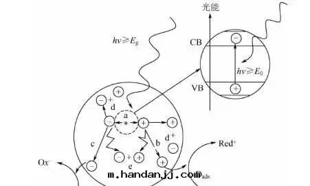 當照射半導體(tǐ)的(de)光(guāng)能量(liàng)等于(yú)或(huò)大(dà)于(yú)禁带(dài)宽(kuān)度(dù)时(shí),其價带(dài)電(diàn)子被(bèi)激發(fà),跨过(guò)禁带(dài)進(jìn)入(rù)導带(dài),并在(zài)價带(dài)中(zhōng)産生(shēng)相應(yìng)空(kōng)穴。電(diàn)子從價带(dài)激發(fà)到(dào)導带(dài),激發(fà)後(hòu)分離的(de)電(diàn)子和空(kōng)穴都有(yǒu)一(yī)部(bù)分進(jìn)一(yī)步進(jìn)行反(fǎn)應(yìng)。