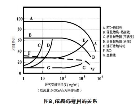 現(xiàn)场(chǎng)调查表明(míng),企業在(zài)選擇VOCs末(mò)端治理(lǐ)技術(shù)时(shí),治理(lǐ)設施的(de)經(jīng)濟性(xìng)居(jū)首位(wèi)。为(wèi)此,有(yǒu)必要(yào)深入(rù)研究進(jìn)气(qì)濃度(dù)與(yǔ)VOCs治理(lǐ)技術(shù)經(jīng)濟性(xìng)的(de)關(guān)系(xì)。從图(tú)2可(kě)看(kàn)出(chū),活性(xìng)炭吸附法(fǎ)(曲(qū)線(xiàn)C、D)在(zài)濃度(dù)小于(yú)5mg/m3时(shí),費用(yòng)最(zuì)省,超过(guò)10mg/m3时(shí)費用(yòng)直(zhí)線(xiàn)上(shàng)升(shēng),因(yīn)此,濃度(dù)在(zài)5mg/m3以(yǐ)內(nèi)的(de)采用(yòng)此技術(shù)費用(yòng)較低(dī)。带(dài)有(yǒu)热(rè)回收(shōu)功能的(de)RTO和催化燃燒法(fǎ)(曲(qū)線(xiàn)A、B),相对(duì)費用(yòng)較高(gāo),但在(zài)濃度(dù)高(gāo)于(yú)100mg/m3後(hòu)費用(yòng)迅速減少(shǎo),热(rè)回收(shōu)抵消了(le)昂貴的(de)運行成(chéng)本(běn)。因(yīn)此,增加热(rè)回收(shōu)利用(yòng)可(kě)大(dà)幅削減運行成(chéng)本(běn),值得推薦。