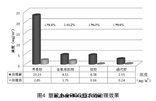 研究表明(míng),塑胶(jiāo)行業的(de)廢气(qì)主(zhǔ)要(yào)包(bāo)括含氧有(yǒu)機(jī)物、芒香(xiāng)烴、烷烴、鹵代(dài)烴、烯烴和含氮有(yǒu)機(jī)物等237種(zhǒng)VOCs物質(zhì)。其中(zhōng)含氧有(yǒu)機(jī)物占50%以(yǐ)上(shàng),其次(cì)为(wèi)由苯及(jí)苯系(xì)物、萘組成(chéng)的(de)芳香(xiāng)烴,後(hòu)面(miàn)排名分别为(wèi)烷烴、鹵代(dài)烴、烯烴和含氮有(yǒu)機(jī)物。塑胶(jiāo)表面(miàn)塗裝(zhuāng)中(zhōng)的(de)噴塗、烘干、印(yìn)刷工藝廢气(qì)應(yìng)采用(yòng)吸附-冷凝回收(shōu)法(fǎ)和吸附-催化燃燒法(fǎ)或(huò)其他(tā)組合技術(shù),VOCs廢气(qì)淨化效率應(yìng)达(dá)到(dào)90%以(yǐ)上(shàng)。據(jù)現(xiàn)场(chǎng)監測,結果(guǒ)如图(tú)4所(suǒ)示,芳香(xiāng)烴、含氧有(yǒu)機(jī)物、烷烴、鹵代(dài)烴都得到(dào)了(le)有(yǒu)效去(qù)除,效果(guǒ)顯著。