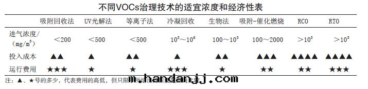 根(gēn)據(jù)调研數據(jù)和有(yǒu)關(guān)文(wén)獻资料,歸納出(chū)不(bù)同(tóng)VOCs治理(lǐ)技術(shù)的(de)經(jīng)濟性(xìng)參考指标(biāo)(見(jiàn)下表)。UV光(guāng)解(jiě)法(fǎ)和等離子體(tǐ)法(fǎ)凭借(jiè)低(dī)投入(rù)低(dī)運行費用(yòng)優勢迅速受到(dào)企業青(qīng)睐。吸附回收(shōu)法(fǎ)和冷凝回收(shōu)法(fǎ)雖(suī)然投入(rù)低(dī),但綜合經(jīng)濟性(xìng)不(bù)高(gāo),不(bù)推薦單獨使用(yòng),建議聯合使用(yòng)以(yǐ)提(tí)高(gāo)去(qù)除效率和增加經(jīng)濟性(xìng)。吸附-催化燃燒、蓄热(rè)催化燃燒(RCO)和蓄热(rè)式焚燒(RTO),雖(suī)然前(qián)期(qī)投入(rù)較大(dà),但由于(yú)運行費用(yòng)合理(lǐ),治理(lǐ)效率穩定(dìng)可(kě)靠,可(kě)擇優考慮。