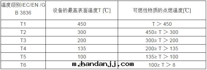 電(diàn)气(qì)設备按其最(zuì)高(gāo)表面(miàn)温(wēn)度(dù)分为(wèi)T1~T6組,使得对(duì)應(yìng)的(de)T1~T6組的(de)電(diàn)气(qì)設备的(de)最(zuì)高(gāo)表面(miàn)温(wēn)度(dù)不(bù)能超过(guò)对(duì)應(yìng)的(de)温(wēn)度(dù)組别的(de)允許值。温(wēn)度(dù)組别、設备表面(miàn)温(wēn)度(dù)和可(kě)燃性(xìng)气(qì)體(tǐ)或(huò)蒸汽的(de)引燃温(wēn)度(dù)之(zhī)間(jiān)的(de)關(guān)系(xì)如下表所(suǒ)示: