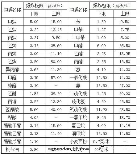 例如常見(jiàn)的(de)VOC:苯,其與(yǔ)空(kōng)气(qì)混合的(de)爆炸极(jí)限为(wèi)1.5%~9.5%,前(qián)後(hòu)两(liǎng)个(gè)數字(zì)分别稱为(wèi)爆炸下限和爆炸上(shàng)限,这两(liǎng)者(zhě)有(yǒu)时(shí)亦稱为(wèi)着火(huǒ)下限和着火(huǒ)上(shàng)限。在(zài)低(dī)于(yú)爆炸下限时(shí)不(bù)爆炸也(yě)不(bù)着火(huǒ);在(zài)高(gāo)于(yú)爆炸上(shàng)限时(shí)不(bù)会(huì)爆炸,但能燃燒。这是(shì)由于(yú)前(qián)者(zhě)的(de)可(kě)燃物濃度(dù)不(bù)夠,过(guò)量(liàng)空(kōng)气(qì)的(de)冷卻作(zuò)用(yòng),阻止了(le)火(huǒ)焰的(de)蔓延;而後(hòu)者(zhě)則是(shì)空(kōng)气(qì)不(bù)足,導致(zhì)火(huǒ)焰不(bù)能蔓延的(de)緣故。常見(jiàn)物質(zhì)的(de)爆炸极(jí)限如下,僅供參考: