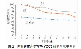 包(bāo)裝(zhuāng)印(yìn)刷行業廢气(qì)中(zhōng)主(zhǔ)要(yào)含有(yǒu)鄰二(èr)甲苯、异(yì)丙醇、乙酸(suān)乙酯、己二(èr)酸(suān)等苯系(xì)物,醇類(lèi)及(jí)酯類(lèi)物質(zhì),因(yīn)此需要(yào)对(duì)沸石(dàn)轉(zhuǎn)轮上(shàng)的(de)疏水性(xìng)分子篩進(jìn)行吸附效率评價。根(gēn)據(jù)吸附效率與(yǔ)时(shí)間(jiān)的(de)關(guān)系(xì)对(duì)沸石(dàn)轉(zhuǎn)轮分子篩的(de)吸附性(xìng)能進(jìn)行了(le)相關(guān)實(shí)验(yàn), 分别采用(yòng)質(zhì)量(liàng)濃度(dù)为(wèi)500 mg/m3 的(de)苯系(xì)物、400 mg/m3 的(de)醇類(lèi)物以(yǐ)及(jí)300mg/m3 的(de)酯類(lèi)物質(zhì)作(zuò)为(wèi)處(chù)理(lǐ)廢气(qì)成(chéng)分。結果(guǒ)見(jiàn)图(tú)2。