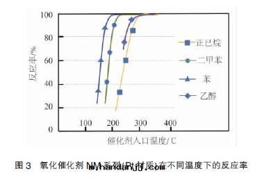 温(wēn)度(dù)不(bù)同(tóng)时(shí), 催化劑对(duì)VOCs 的(de)處(chù)理(lǐ)活性(xìng)效率也(yě)不(bù)同(tóng),因(yīn)此需要(yào)寻找(zhǎo)催化劑的(de)最(zuì)佳使用(yòng)温(wēn)度(dù)。根(gēn)據(jù)VOCs 廢气(qì)中(zhōng)含有(yǒu)的(de)主(zhǔ)要(yào)有(yǒu)機(jī)挥發(fà)物(正(zhèng)己烷、二(èr)甲苯、苯、乙醇等物質(zhì)),在(zài)不(bù)同(tóng)入(rù)口(kǒu)温(wēn)度(dù)条(tiáo)件(jiàn)下对(duì)其進(jìn)行轉(zhuǎn)化率測試评價,結果(guǒ)見(jiàn)图(tú)3。