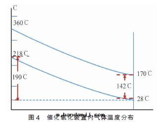 工況:入(rù)口(kǒu)气(qì)體(tǐ)温(wēn)度(dù)T1=28 ℃,處(chù)理(lǐ)設备一(yī)次(cì)換热(rè)气(qì)體(tǐ)温(wēn)度(dù)T2=218 ℃,催化氧化後(hòu)气(qì)體(tǐ)温(wēn)度(dù)T3=360,廢气(qì)餘热(rè)利用(yòng)換热(rè)後(hòu)出(chū)口(kǒu)温(wēn)度(dù)T4=170 ℃。換热(rè)温(wēn)度(dù)差值詳見(jiàn)图(tú)4。