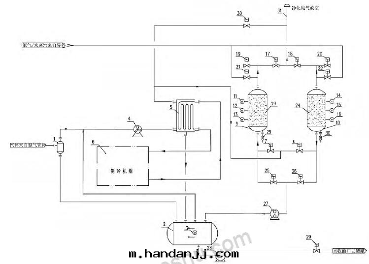 1 - 凝液收(shōu)集罐(guàn); 2 - 气(qì)液分離罐(guàn); 3 - 液位(wèi)變(biàn)送器; 4 - 風(fēng)機(jī); 5 - 冷箱(xiāng); 6 - 制冷機(jī)組; 7 - 吸附罐(guàn)進(jìn)口(kǒu)閥A; 8 - 吸附罐(guàn)進(jìn)口(kǒu)閥B; 9 - 吸附罐(guàn)A; 10 - 吸附罐(guàn)B; 11 - 温(wēn)度(dù)變(biàn)送器A; 12 - 温(wēn)度(dù)變(biàn)送器B; 13 - 温(wēn)度(dù)變(biàn)送器C; 14 - 温(wēn)度(dù)變(biàn)送器D; 15 - 温(wēn)度(dù)變(biàn)送器E; 16 - 温(wēn)度(dù)變(biàn)送器F; 17 - 吸附罐(guàn)出(chū)口(kǒu)閥A; 18- 吸附罐(guàn)出(chū)口(kǒu)閥B; 19 - 吸附罐(guàn)破真(zhēn)空(kōng)閥A; 20 - 吸附罐(guàn)破真(zhēn)空(kōng)閥B; 21 - 吹掃气(qì)進(jìn)口(kǒu)閥A; 22 - 吹掃气(qì)進(jìn)口(kǒu)閥B; 23 - 吸附劑床(chuáng)层(céng)A; 24 - 吸附劑床(chuáng)层(céng)B; 25 - 真(zhēn)空(kōng)脱附閥A; 26 - 真(zhēn)空(kōng)脱附閥B; 27 - 真(zhēn)空(kōng)泵; 28 - 回液泵; 29 - 外(wài)輸液流量(liàng)開(kāi)關(guān)閥;30 - 緊急放(fàng)空(kōng)閥; 31 - 排放(fàng)筒