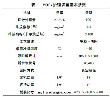老(lǎo)罐(guàn)区苯罐(guàn)采用(yòng)江蘇金(jīn)門(mén)能源裝(zhuāng)备有(yǒu)限公(gōng)司設計(jì)、制造的(de)JM - VRECS - CD/AD - 100 型VOCs 治理(lǐ)裝(zhuāng)置,冷凝+ 吸附集成(chéng)工藝,裝(zhuāng)置主(zhǔ)要(yào)參數如表1。
