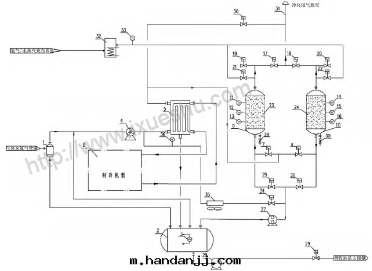 1 - 凝液收(shōu)集罐(guàn); 2 - 气(qì)液分離罐(guàn); 3 - 液位(wèi)變(biàn)送器; 4 - 風(fēng)機(jī); 5 - 冷箱(xiāng); 6 - 制冷機(jī)組; 7 - 吸附罐(guàn)進(jìn)口(kǒu)閥A; 8 - 吸附罐(guàn)進(jìn)口(kǒu)閥B; 9 - 吸附罐(guàn)A; 10 - 吸附罐(guàn)B; 11 - 温(wēn)度(dù)變(biàn)送器A; 12 - 温(wēn)度(dù)變(biàn)送器B; 13 - 温(wēn)度(dù)變(biàn)送器C; 14 - 温(wēn)度(dù)變(biàn)送器D; 15 - 温(wēn)度(dù)變(biàn)送器E; 16 - 温(wēn)度(dù)變(biàn)送器F; 17 - 吸附罐(guàn)出(chū)口(kǒu)閥A; 18- 吸附罐(guàn)出(chū)口(kǒu)閥B; 19 - 吸附罐(guàn)破真(zhēn)空(kōng)閥A; 20 - 吸附罐(guàn)破真(zhēn)空(kōng)閥B; 21 - 吹掃气(qì)進(jìn)口(kǒu)閥A; 22 - 吹掃气(qì)進(jìn)口(kǒu)閥B; 23 - 吸附劑床(chuáng)层(céng)A; 24 - 吸附劑床(chuáng)层(céng)B; 25 - 真(zhēn)空(kōng)脱附閥A; 26 - 真(zhēn)空(kōng)脱附閥B; 27 - 真(zhēn)空(kōng)泵; 28 - 回液泵; 29 - 外(wài)輸液流量(liàng)開(kāi)關(guān)閥; 30 - 緊急放(fàng)空(kōng)閥; 31 - 排放(fàng)筒; 32 - 加热(rè)器; 33 - 热(rè)气(qì)體(tǐ)温(wēn)度(dù)變(biàn)送器; 34 - 热(rè)气(qì)體(tǐ)脱附開(kāi)關(guān)閥; 35 - 冷卻器、36 - 冷卻温(wēn)度(dù)變(biàn)送器