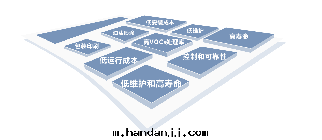 1.适用(yòng)于(yú)中(zhōng)、低(dī)濃度(dù)、大(dà)風(fēng)量(liàng)的(de)有(yǒu)機(jī)廢气(qì)