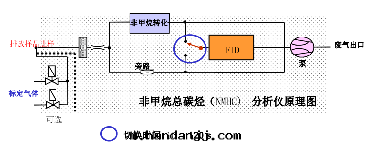 通(tòng)过(guò)氫气(qì)的(de)燃燒形成(chéng)火(huǒ)焰,火(huǒ)焰将空(kōng)气(qì)中(zhōng)的(de)碳氫化合物離子化,形成(chéng)的(de)正(zhèng)負離子形成(chéng)電(diàn)流,然後(hòu)将電(diàn)流放(fàng)大(dà),轉(zhuǎn)換成(chéng)对(duì)應(yìng)濃度(dù)的(de)信(xìn)号(hào)輸出(chū)。針(zhēn)对(duì)非(fēi)甲烷总碳烴的(de)測量(liàng), 需要(yào)添加非(fēi)甲烷高(gāo)温(wēn)氧化模块(kuài)来(lái)測量(liàng)甲烷,最(zuì)後(hòu)結果(guǒ)将甲烷扣(kòu)除。